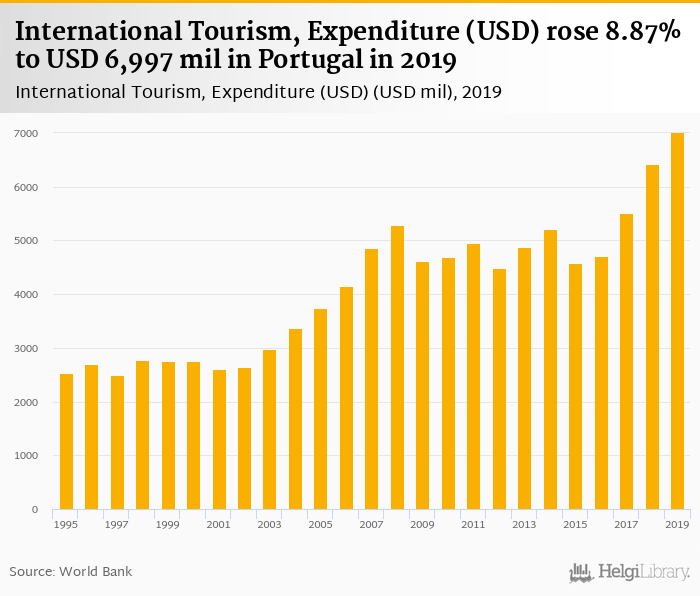 International Tourism, Expenditure (USD) rose 8.87% to USD 6,997 mil in Portugal in 2019