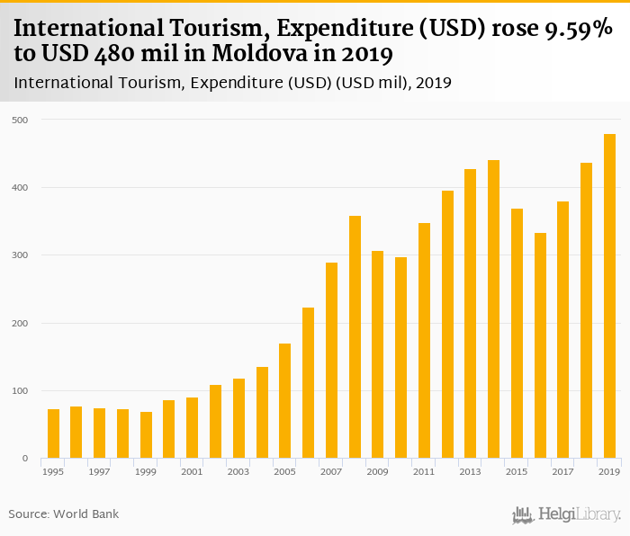 Expenditure of international tourism rose 9.59% to USD 480 mil in Moldova in 2019, according to Eurostat.