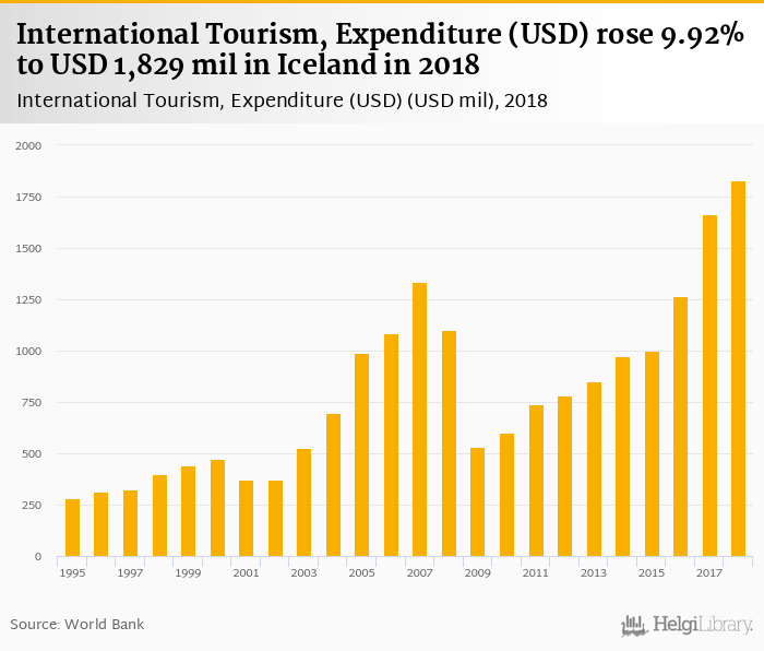 Historically, expenditure of international tourism in Iceland reached an all time high of USD 1,829 mil in 2018 and an all time low of USD 282 mil in 1995. When compared to Iceland's main peers, expenditure of international tourism in Denmark amounted to USD 10,485 mil, USD 18,592 mil in Norway, USD 18,056 mil in Sweden and USD 68,888 mil in United Kingdom in 2018.
