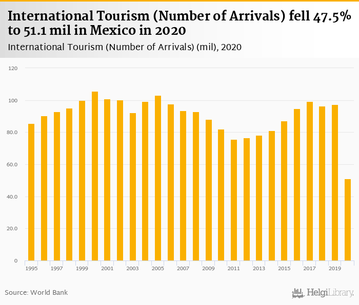 International Tourism (Number of Arrivals) fell 47.5% to 51.1 mil in Mexico in 2020