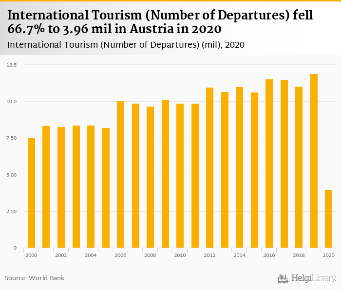 Number of international tourist departures fell 66.7% to 3.96 mil in Austria in 2020, according to Eurostat.