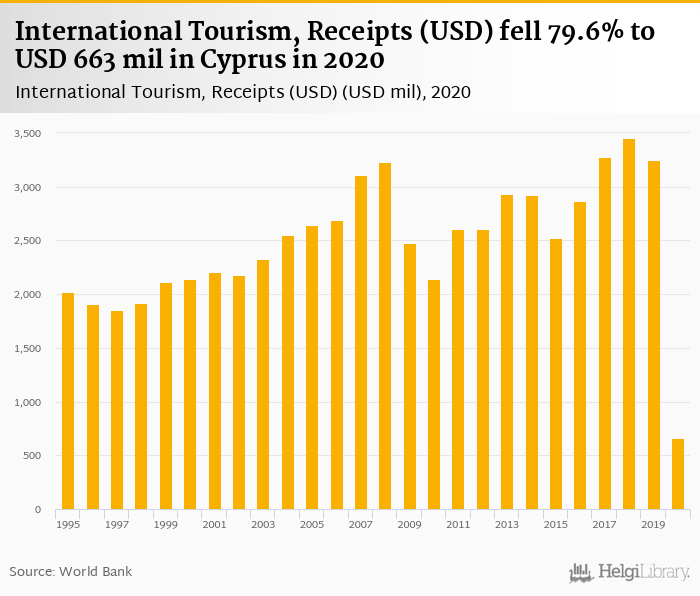 Historically, receipts of international tourism in Cyprus reached an all time high of USD 3,449 mil in 2018 and an all time low of USD 663 mil in 2020. When compared to Cyprus's main peers, receipts of international tourism in Egypt amounted to USD 4,874 mil, USD 6,193 mil in Greece, USD 2,661 mil in Israel and USD 13,771 mil in Turkey in 2020.