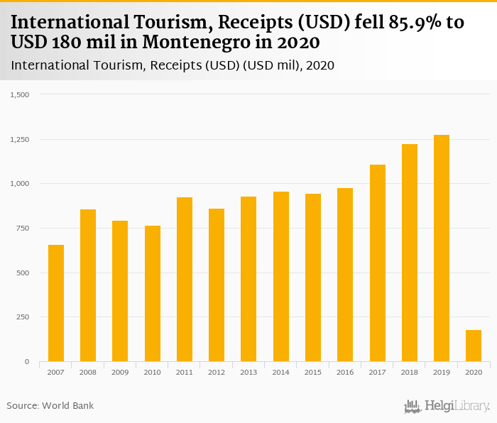 Receipts of international tourism fell 85.9% to USD 180 mil in Montenegro in 2020, according to Eurostat.