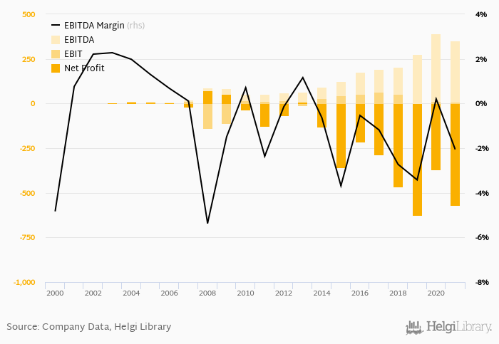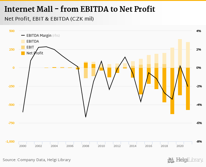 Internet Mall made a net profit of CZK -570 mil with revenues of CZK 10,625 mil in 2021, down by 54.7% and down by 11.1%, respectively, compared to the previous year. This translates into a net margin of -5.37%.