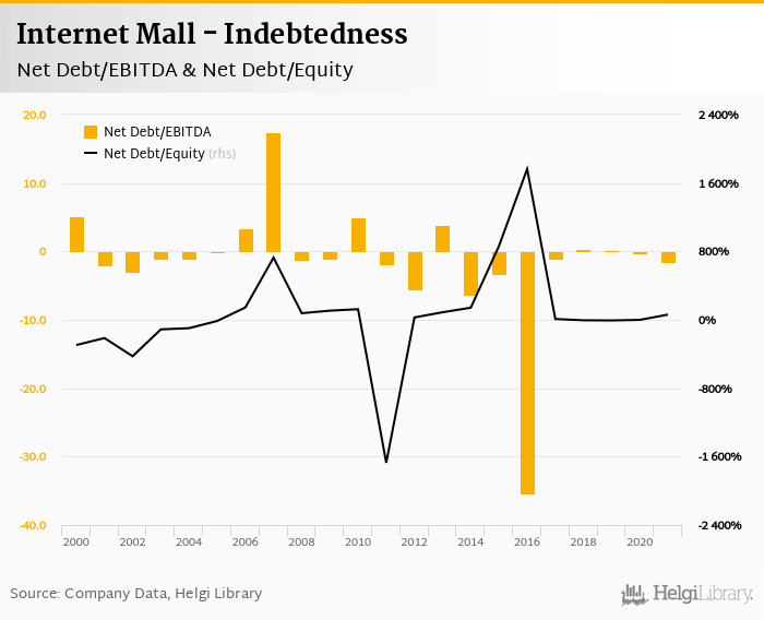 Internet Mall's net debt stood at CZK 354 mil and accounted for 61.1% of equity at the end of 2021. The ratio is up 61.9 pp compared to the previous year.