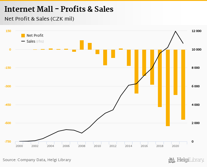 Internet Mall made a net profit of CZK -570 mil in 2021, down 54.7% compared to the previous year. Total sales reached CZK 10,625 mil, which is down 11.1% when compared to the previous year.