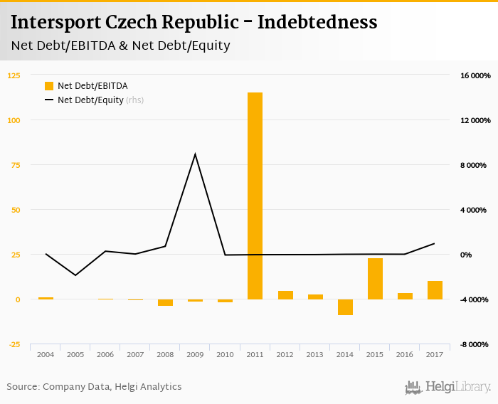Intersport Czech Republic's net debt stood at CZK 188 mil and accounted for 934% of equity at the end of 2017. The ratio is up 962 pp compared to the previous year.