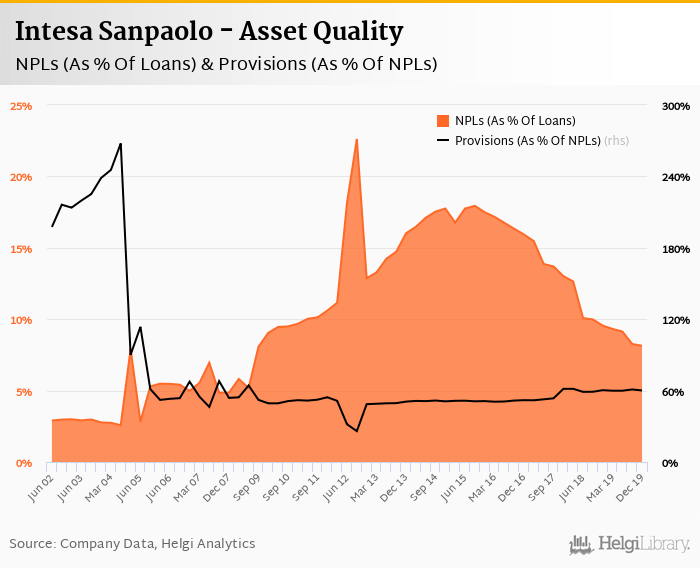 Intesa Sanpaolo's non-performing loans reached 8.14% of total loans at the end of 2019-12-31, down from 9.55% compared to the previous year. Historically, the NPL ratio hit an all time high of 22.6% in 2012-09-30 and an all time low of 2.58% in 2004-09-30.