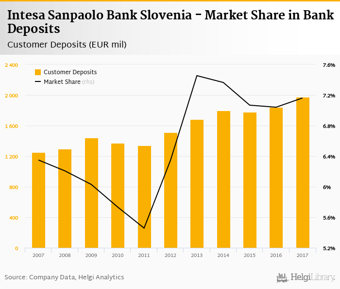 Intesa Sanpaolo Bank Slovenia accounted for 7.16% of all customer deposits taken by banks in Slovenia at the end of 2017. Historically, the bank’s market share in customer deposits reached an all time high of 7.45% in 2013 and an all time low of 5.46% in 2011.
