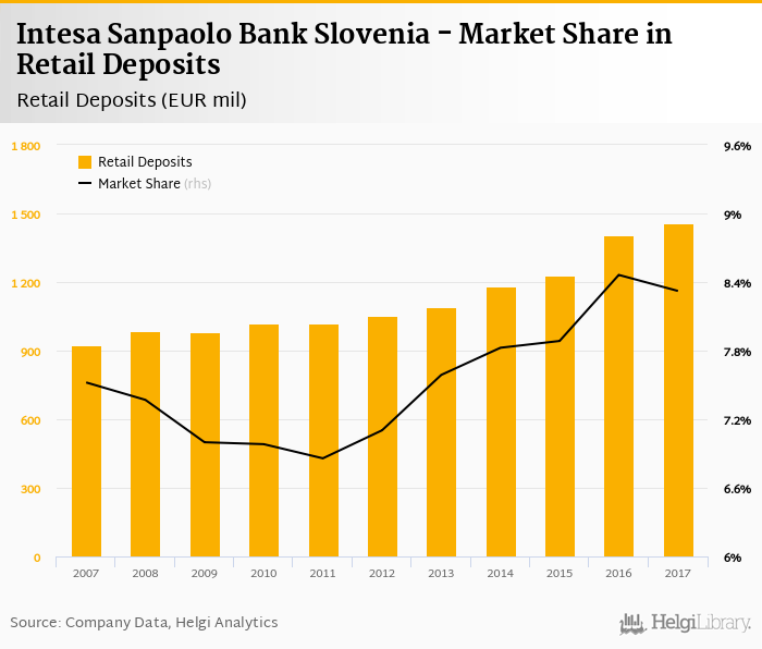 Intesa Sanpaolo Bank Slovenia accounted for 8.32% of all retail deposits taken by banks in Slovenia at the end of 2017. Historically, the bank’s market share in retail deposits reached an all time high of 8.46% in 2016 and an all time low of 6.86% in 2011.