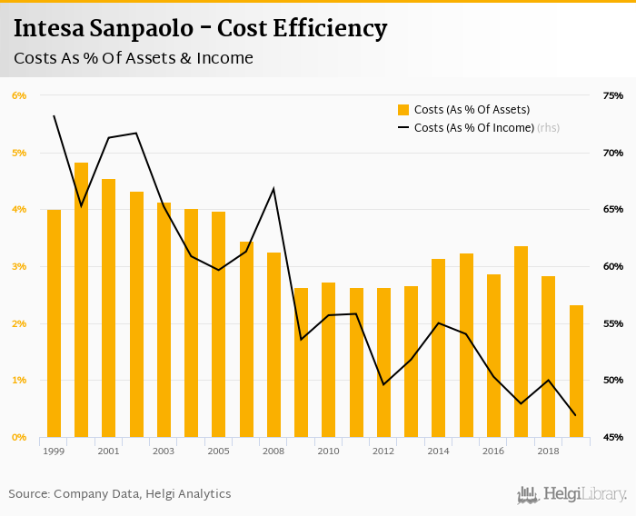 Intesa Sanpaolo's cost to income ratio reached 46.9% in 2019, down from 50.0% compared to the previous year.