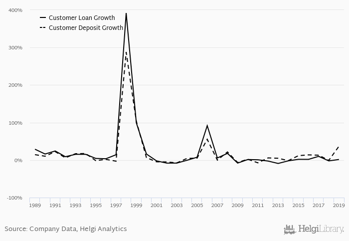On the other hand, bank's customer deposit growth amounted to 36.8% at the end of 2019, up from -0.757% when compared to the previous year. Historically, the bank’s deposit growth reached an all time high of 288% in 1998 and an all time low of -7.49% in 2003. In the last decade, the average annual loan growth amounted to 7.26%.
