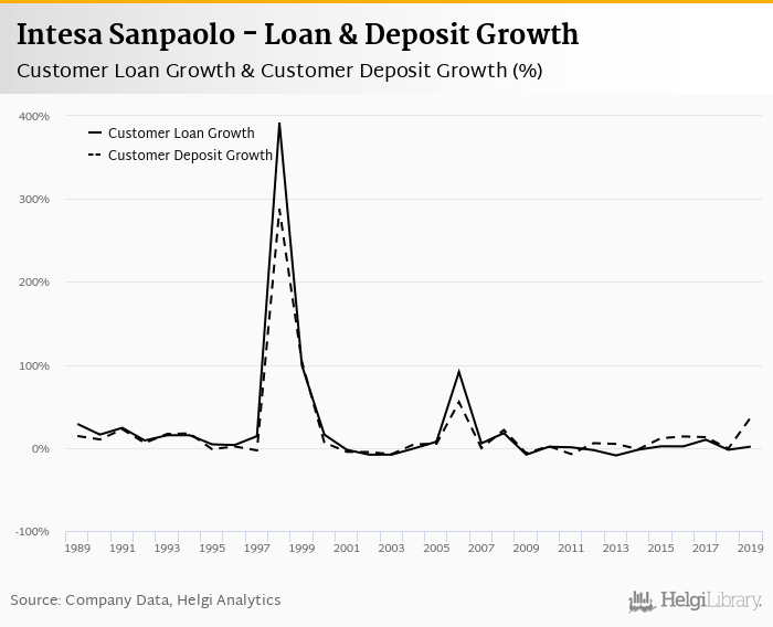 Intesa Sanpaolo's customer loan growth reached 1.61% in 2019, up from -2.21% compared to the previous year. Historically, the bank’s loans growth reached an all time high of 392% in 1998 and an all time low of -9.05% in 2013. In the last decade, the average annual loan growth amounted to 0.062%.