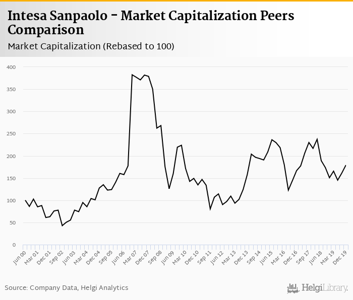 Intesa Sanpaolo stock traded at EUR 2.35 per share at the end of fourth quarter of 2019 implying a market capitalization of USD 46,175 mil.