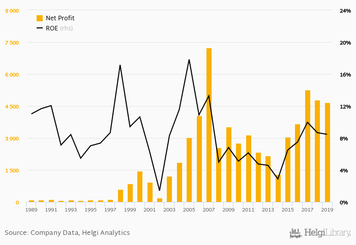 Historically, the bank’s net profit reached an all time high of EUR 7,250 mil in 2007 and an all time low of EUR 68.9 mil in 1994. The average profit in the last five years amounted to EUR 4,287 mil.