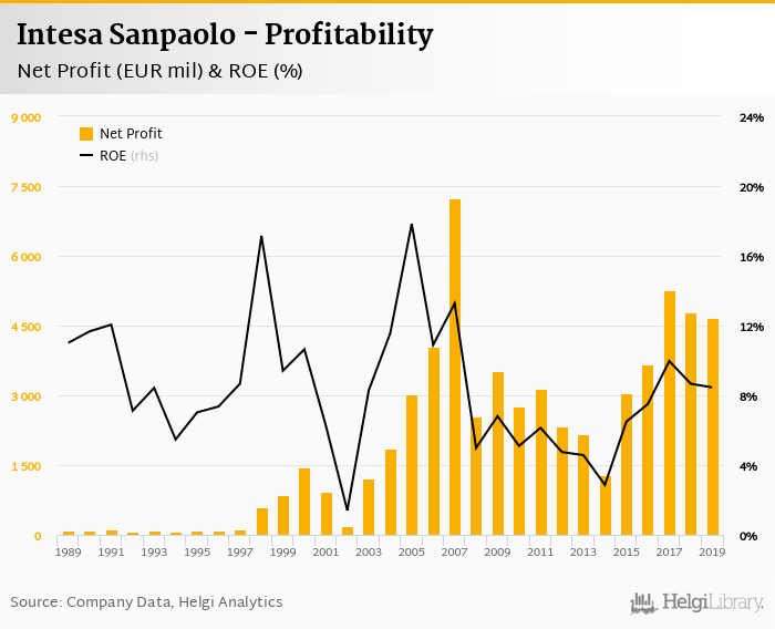 Intesa Sanpaolo made a net profit of EUR 4,677 mil in 2019, down 2.40% compared to the previous year. This implies a return on equity of 8.45%.