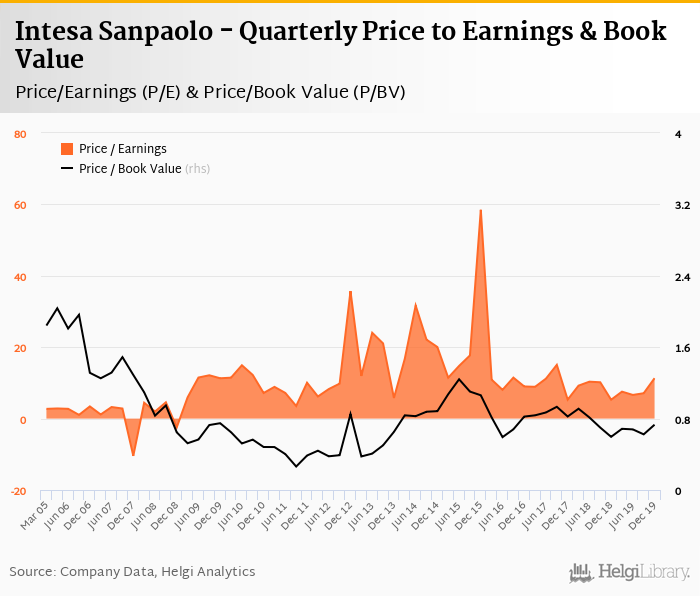 Intesa Sanpaolo stock traded at EUR 2.35 per share at the end fourth quarter of 2019 implying a market capitalization of USD 46,175 mil.