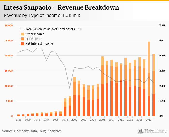 Intesa Sanpaolo generated total banking revenues of EUR 20,672 mil in 2018, down 16.260228469578% compared to the previous year.