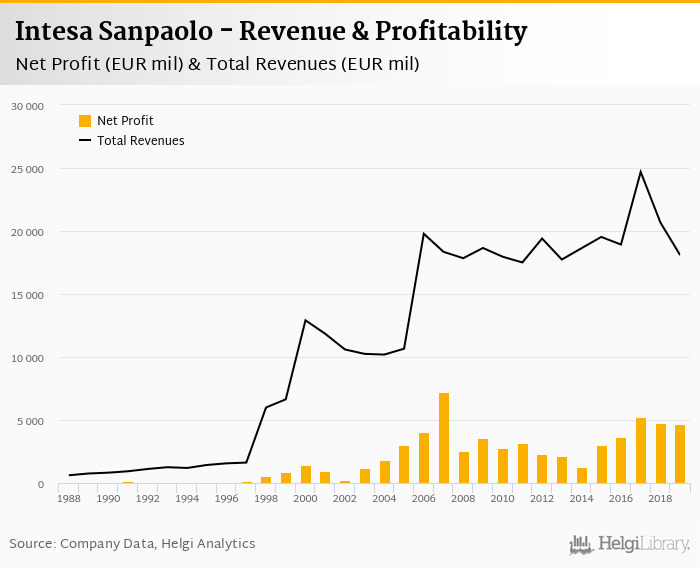 Intesa Sanpaolo made a net profit of EUR 4,677 mil under revenues of EUR 18,083 mil in 2019, up -2.3998330550918% and -12.524187306502% respectively compared to the previous year.