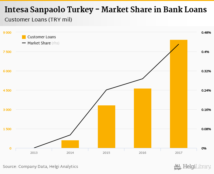 Intesa Sanpaolo Turkey's customer loans reached TRY 8,436 mil in 2017, up 81.3% compared to the previous year.