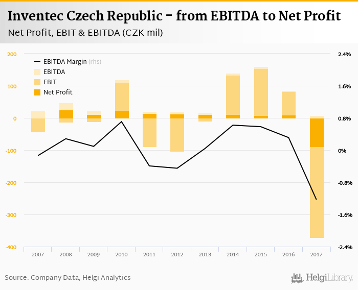 Inventec Czech Republic made a net profit of CZK -88.6 mil with revenues of CZK 29,479 mil in 2017, down by 994% and up by 6.65%, respectively, compared to the previous year. This translates into a net margin of -0.301%.