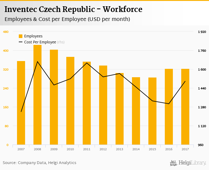 Inventec Czech Republic employed 322 employees in 2017, down 0.31% compared to the previous year. Historically, between 2007 and 2017, the firm's workforce hit a high of 424 employees in 2008 and a low of 286 employees in 2015.