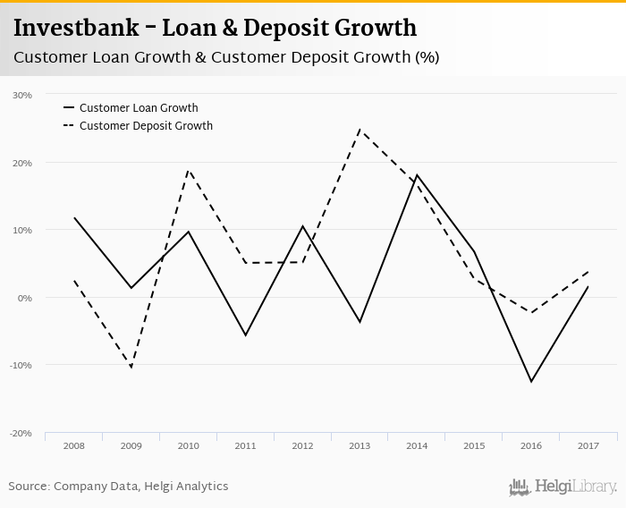 Investbank's customer loan growth reached 1.57% in 2017, up from -12.5% compared to the previous year. Historically, the bank’s loans growth reached an all time high of 18.0% in 2014 and an all time low of -12.5% in 2016. In the last decade, the average annual loan growth amounted to 0%.