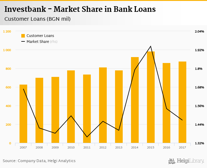 Investbank accounted for 1.47% of all customer loans issued in Bulgaria at the end of 2017. Historically, the bank’s market share in customer loans reached an all time high of 1.94% in 2015 and an all time low of 1.36% in 2011.