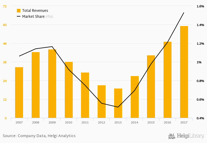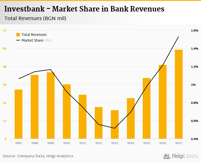 As a result, Investbank accounted for 1.53% of all bank revenues generated by banks in Bulgaria in 2017. Historically, the bank’s market share in total revenues reached an all time high of 1.53% in 2017 and an all time low of 0.515% in 2013.