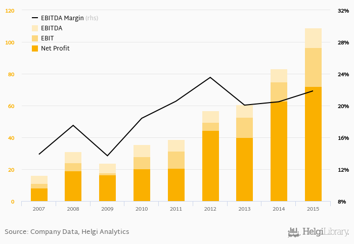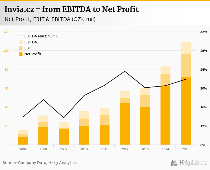 Invia.cz made a net profit of CZK 72.0 mil with revenues of CZK 499 mil in 2015, up by 14.4% and up by 22.9%, respectively, compared to the previous year. This translates into a net margin of 14.4%.