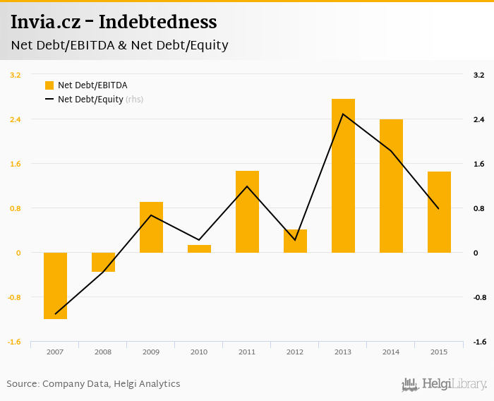 Invia.cz's net debt stood at CZK 159 mil and accounted for 0.772 of equity at the end of 2015. The ratio is down 1.05 pp compared to the previous year.