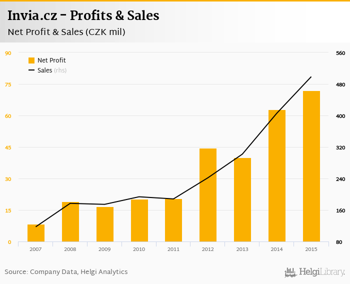 Invia.cz made a net profit of CZK 72.0 mil in 2015, up 14.4% compared to the previous year. Total sales reached CZK 499 mil, which is up 22.9% when compared to the previous year.