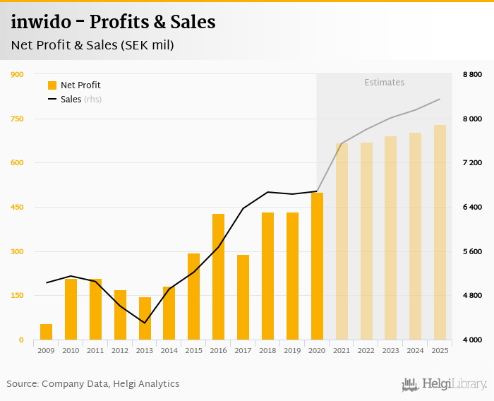inwido made a net profit of SEK 501 mil in 2020, up 15.6% compared to the previous year. Total sales reached SEK 6,681 mil, which is up 0.759% when compared to the previous year.