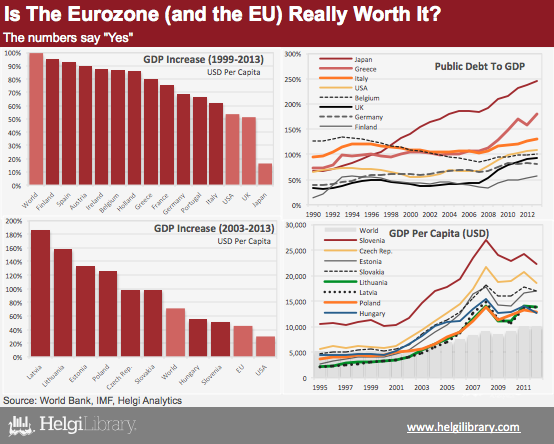 Since 1999 when most Eurozone members entered the common currency, the GDP per capita in the Eurozone-economies has increased by 62-95% in USD-terms. That is more than in the USA (53%), UK (51%), or Japan (16%). In addition, the indebtedness of most Eurozone members (measured by their public debt to GDP) have increased less than those of the USA, Japan and UK.