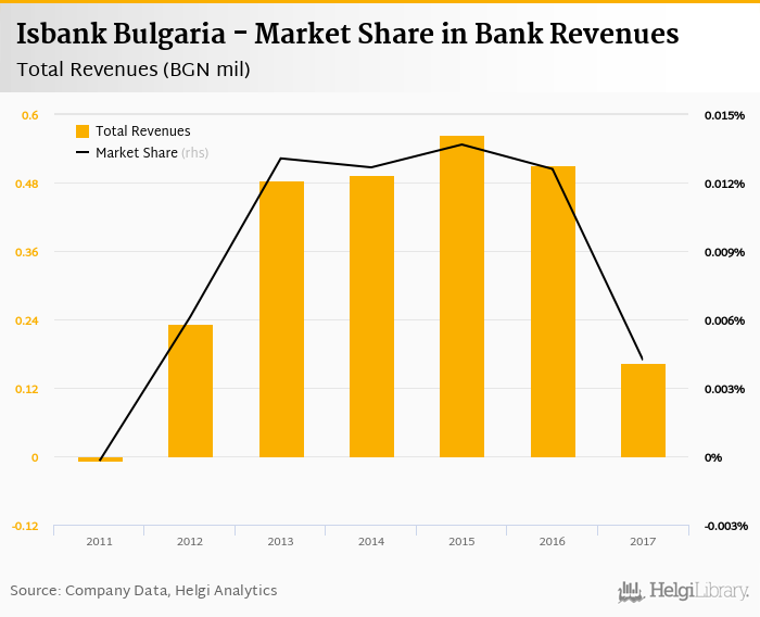 As a result, Isbank Bulgaria accounted for 0.004% of all bank revenues generated by banks in Bulgaria in 2017. Historically, the bank’s market share in total revenues reached an all time high of 0.014% in 2015 and an all time low of < -0.001% in 2011.