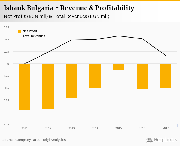 Isbank Bulgaria made a net profit of BGN -0.494 mil under revenues of BGN 0.163 mil in 2017, up 4.45% and -68.1% respectively compared to the previous year.