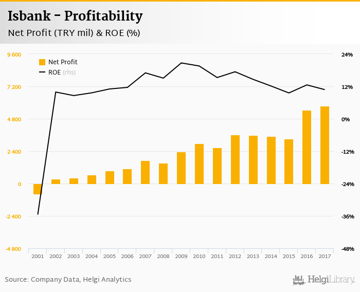 Isbank made a net profit of TRY 5,749 mil in 2017, up 5.51% compared to the previous year. This implies a return on equity of 10.8%.