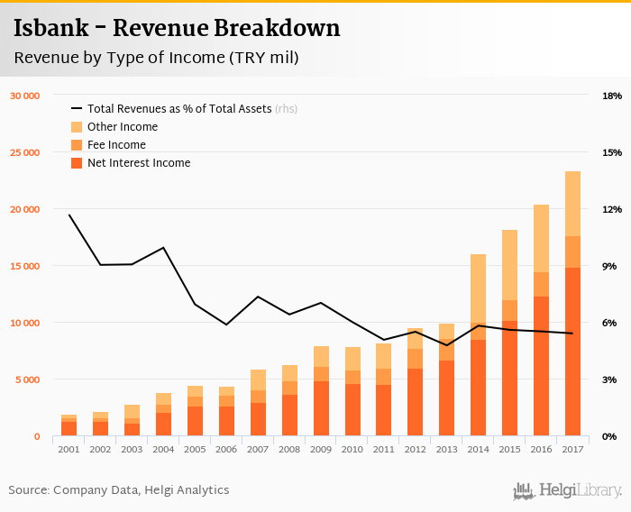 Historically, the bank’s revenues containing of interest, fee and other non-interest income reached an all time high of TRY 23,321 mil in 2017 and an all time low of TRY 1,913 mil in 2001. The average revenue in the last five years amounted to TRY 17,572 mil.