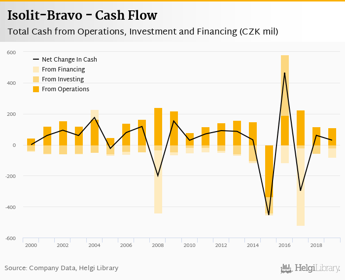 Isolit-Bravo's operating cash flow stood at CZK 110 mil in 2019, down 4.4% when compared to the previous year. Historically, between 2000 - 2019, the firm’s operating cash flow reached a high of CZK 240 mil in 2008 and a low of CZK -337 mil in 2015.