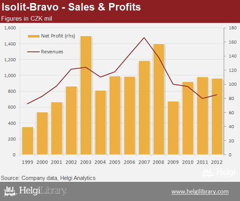 Although sales have halved in 2012 compared to its peak year of 2007 when they reached nearly CZK 1.5 bil, the Company remains nicely profitable (with a net margin of over 14% in 2012) and cash rich (net cash accounted for 73% of Company's equity at the end of 2012).
