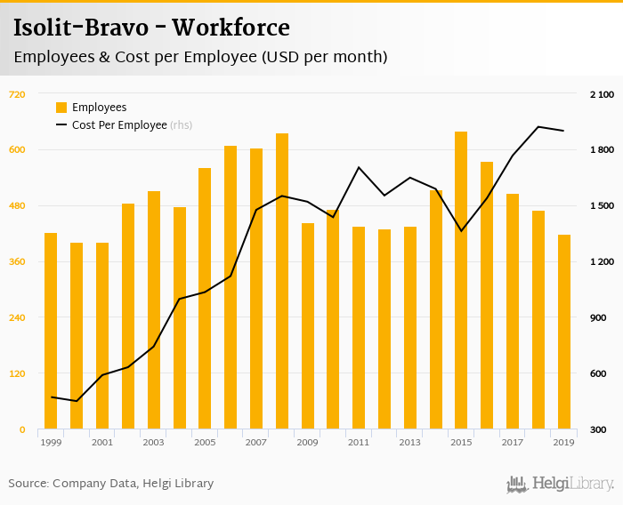 Isolit-Bravo employed 419 employees in 2019, down 10.9% compared to the previous year. Historically, between 1999 and 2019, the firm's workforce hit a high of 640 employees in 2015 and a low of 402 employees in 2001.