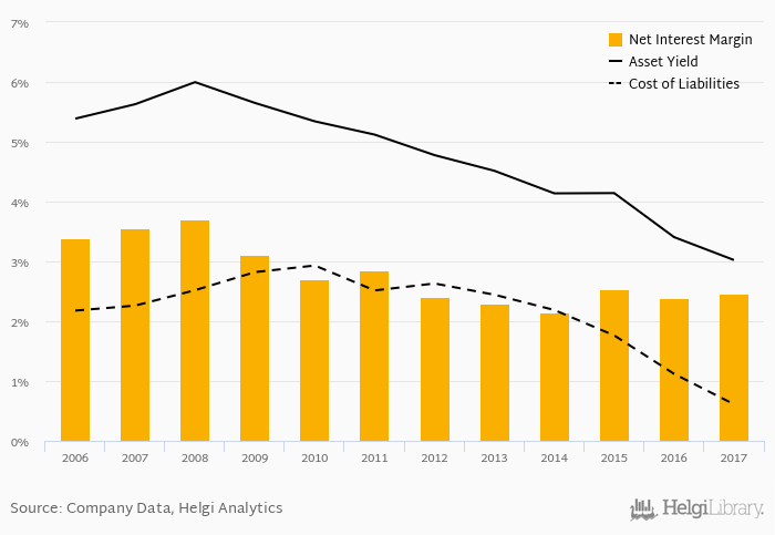 Historically, the bank’s net interest margin reached an all time high of 3.71% in 2008 and an all time low of 2.15% in 2014. The average margin in the last five years amounted to 2.37%.