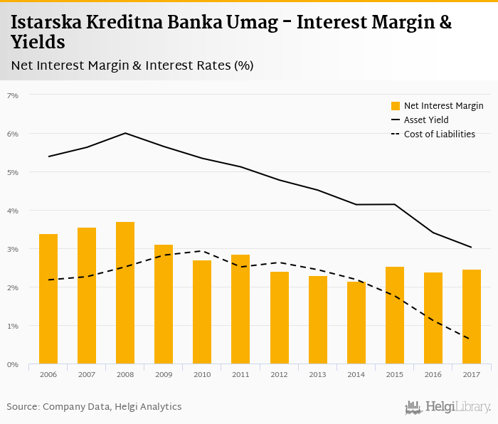 Istarska Kreditna Banka Umag's net interest margin amounted to 2.46% in 2017, up from 2.38% compared to the previous year.