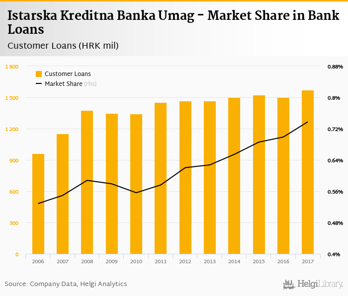 Istarska Kreditna Banka Umag's customer loans reached HRK 1,571 mil in 2017, up 4.70% compared to the previous year.