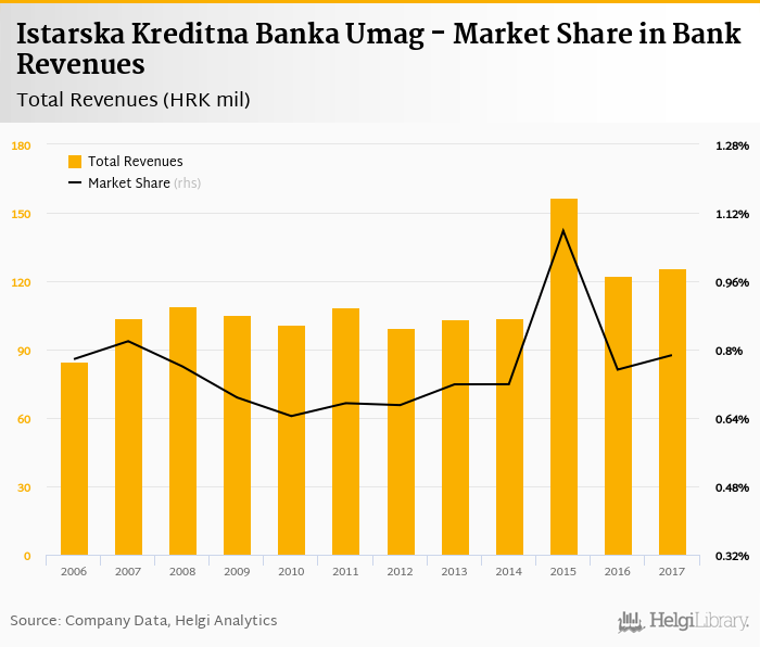 As a result, Istarska Kreditna Banka Umag accounted for 0.787% of all bank revenues generated by banks in Croatia in 2017. Historically, the bank’s market share in total revenues reached an all time high of 1.08% in 2015 and an all time low of 0.644% in 2010.