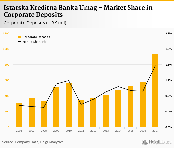 Istarska Kreditna Banka Umag accounted for 1.48% of all corporate deposits taken by banks in Croatia at the end of 2017. Historically, the bank’s market share in corporate deposits reached an all time high of 1.48% in 2017 and an all time low of 0.676% in 2008.