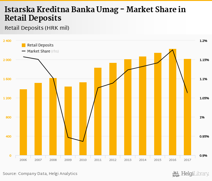 Istarska Kreditna Banka Umag accounted for 1.06% of all retail deposits taken by banks in Croatia at the end of 2017. Historically, the bank’s market share in retail deposits reached an all time high of 1.18% in 2016 and an all time low of 0.936% in 2010.