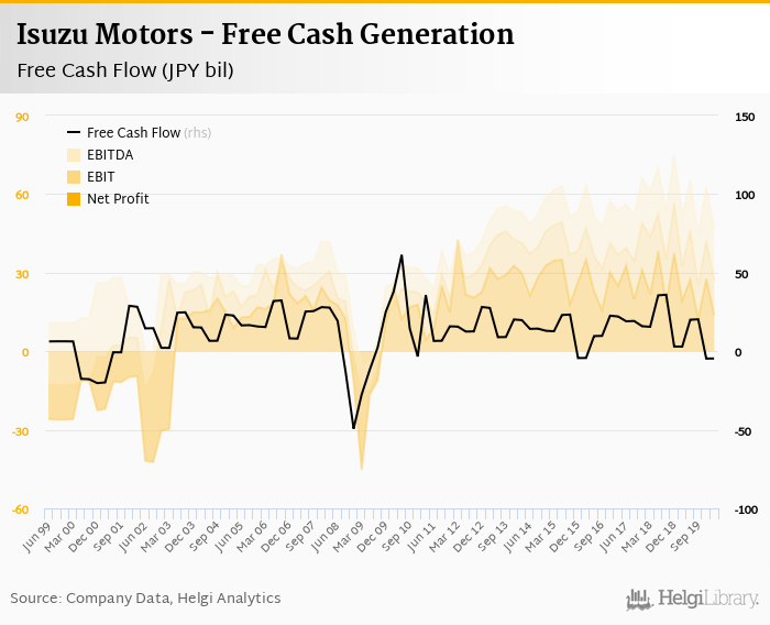 Isuzu Motors made a net profit of JPY 13.8 bil with revenues of JPY 562 bil in 1Q2020, down by 29.1% and up by 0.153%, respectively, compared to the previous year. This translates into a net margin of 2.46%.