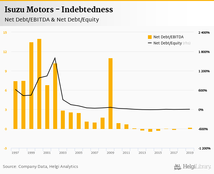 Isuzu Motors's net debt stood at JPY 43.4 bil and accounted for 3.80% of equity at the end of 2019. The ratio is up 3.92 pp compared to the previous year.