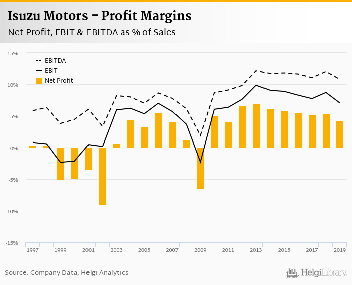 Isuzu Motors made a net profit of JPY 86.9 bil with revenues of JPY 2,079 bil in 2019, down by 25.0% and down by 3.70%, respectively, compared to the previous year.